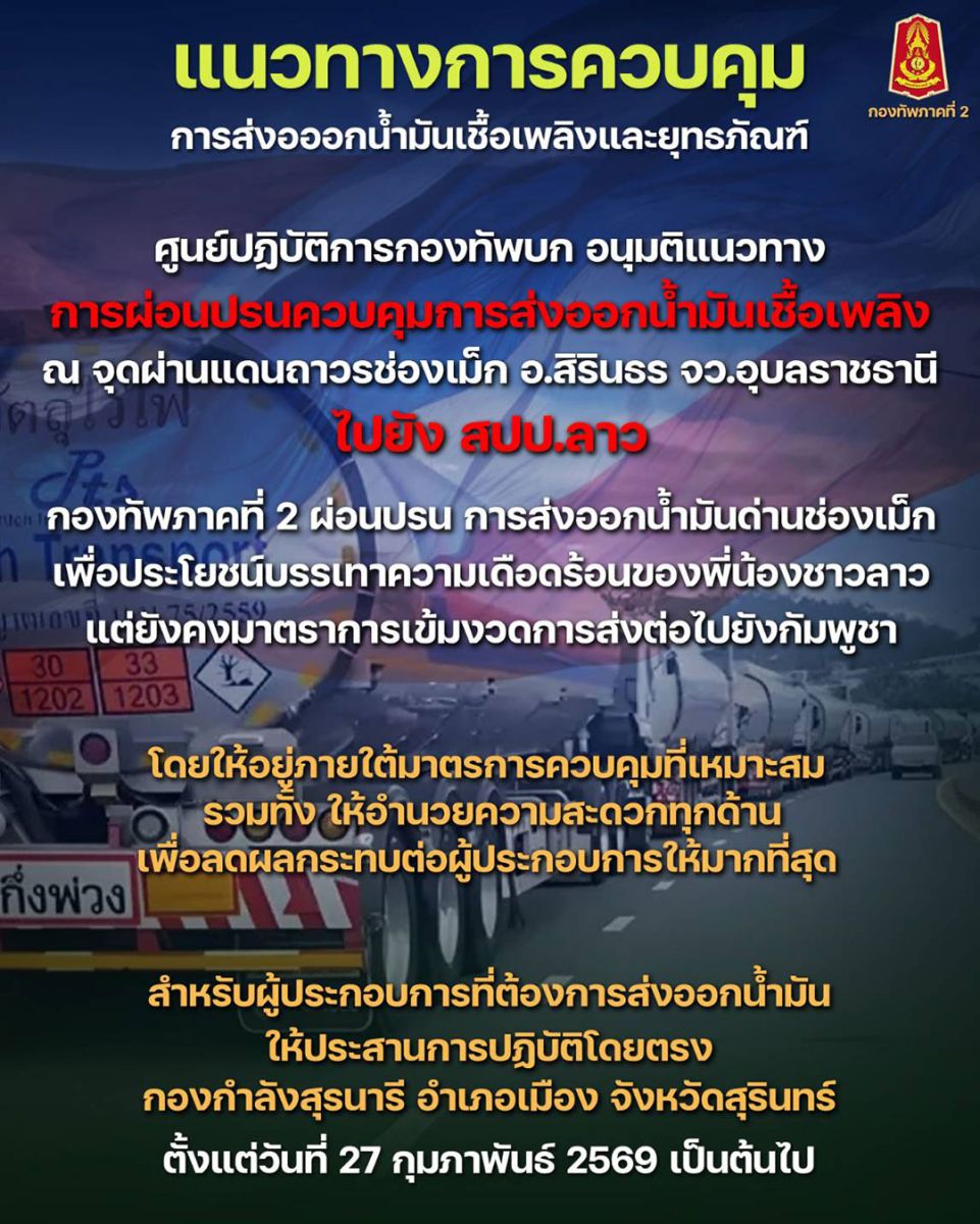 27 กุมภาพันธ์ 2569 กองทัพภาคที่ 2 ได้มีคำสั่งผ่อนปรนการส่งออกน้ำมันบริเวณด่านช่องเม็ก จังหวัดอุบลราชธานี โดยศูนย์ปฏิบัติการกองทัพบก ได้อนุมัติแนวทางผ่อนปรนการควบคุมการส่งออกน้ำมันเชื้อเพลิง ณ จุดผ่านแดนถาวรช่องเม็ก อำเภอสิรินธร จังหวัดอุบลราชธานี เพื่อส่งออกไปยังสาธารณรัฐประชาธิปไตยประชาชนลาว (สปป.ลาว) ซึ่งการผ่อนปรนดังกล่าวมีเป้าหมายเพื่อบรรเทาความเดือดร้อนของประชาชนชาวลาว