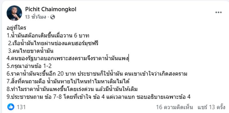 พิชิต คปท. เปิด 9 ข้อสงสัย หลังน้ำมันพุ่ง 6 บาท