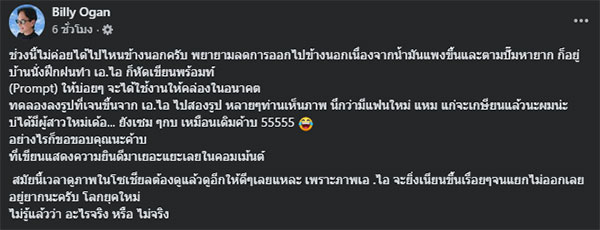 ล่าสุด บิลลี่ โอแกน ได้ออกมาเคลื่อนไหวผ่านเฟซบุ๊กส่วนตัวอีกครั้ง พร้อมเปิดเผยความจริงเบื้องหลังภาพดังกล่าว โดยระบุว่า “ช่วงนี้ไม่ค่อยได้ไปไหนข้างนอกครับ พยายามลดการออกไปข้างนอกเนื่องจากน้ำมันแพงขึ้นและตามปั๊มหายาก ก็อยู่บ้านนั่งฝึกฝนทำ เอ.ไอ ก็หัดเขียนพร้อมท์ (Prompt) ให้บ่อยๆ จะได้ใช้งานให้คล่องในอนาคต