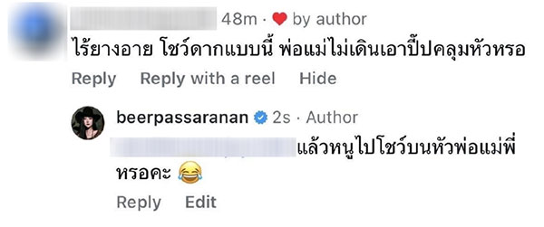 โดยมีชาวเน็ตรายหนึ่งเข้ามาคอมเมนต์ด้วยถ้อยคำหยาบคาย ว่า “ไร้ยางอาย โชว์ดากแบบนี้ พ่อแม่เดินไม่เอาปี๊ปคลุมหัวหรอ” งานนี้เจ้าตัวก็ตอบกลับแบบสั้นๆ แต่ได้ใจความว่า “แล้วหนูไปโชว์บนหัวพ่อแม่พี่เหรอคะ”