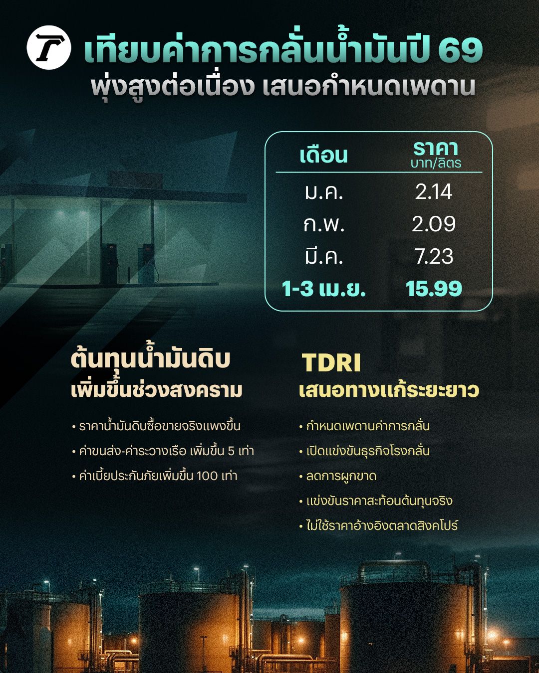 เทียบค่าการกลั่นน้ำมันปี 69 พุ่งสูงต่อเนื่อง พบผลกระทบจากสงครามทำให้ต้นทุนน้ำมันดิบและการขนส่งทางเรือสูงขึ้นกว่าปกติหลายเท่า ด้าน TDRI เสนอทางแก้ระยะยาว กำหนดเพดานค่าการกลั่น พร้อมรื้อโครงสร้างพลังงาน เปิดแข่งขันธุรกิจโรงกลั่น ลดการผูกขาด เพื่อให้ราคาน้ำมันสะท้อนต้นทุนจริง เลิกอิงราคาตลาดสิงคโปร์