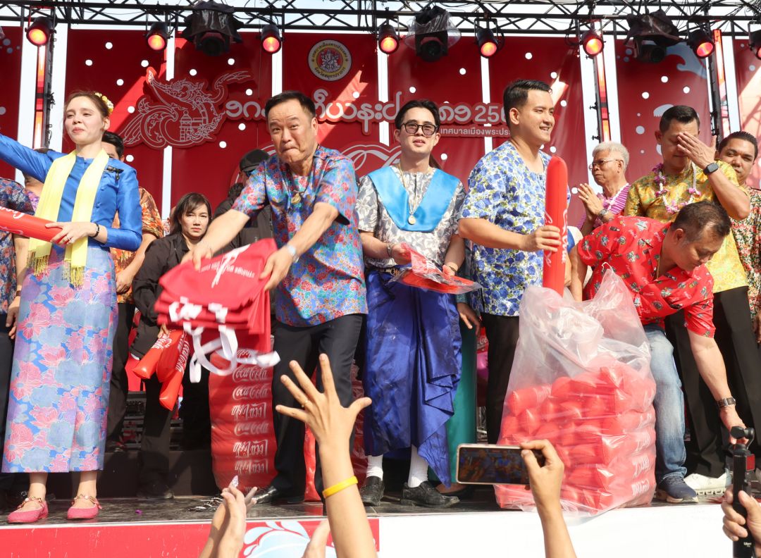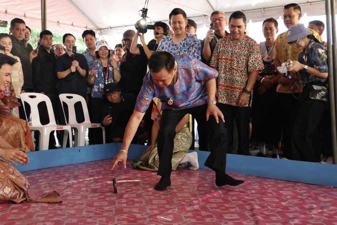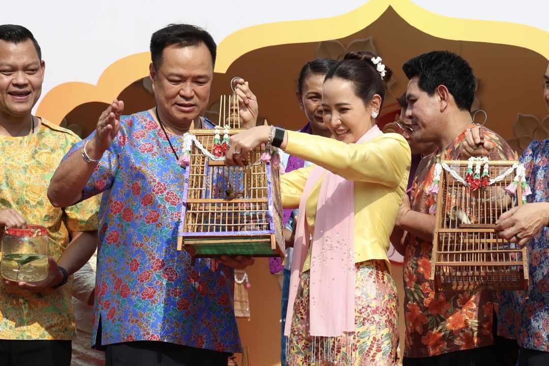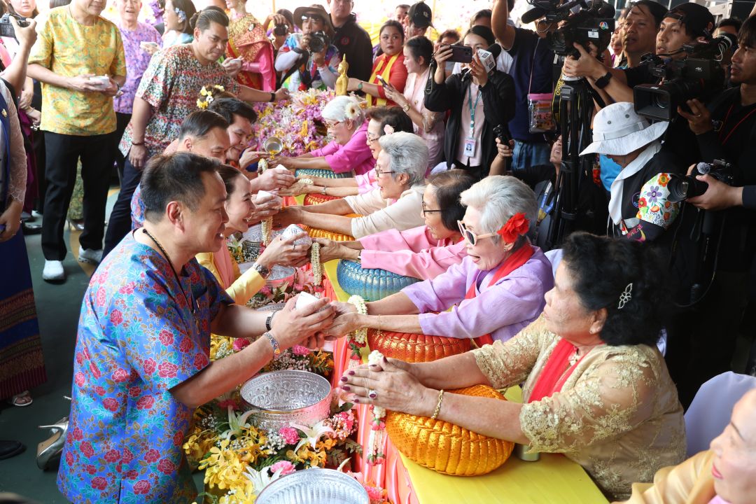 ต่อมานายกฯและภริยา ร่วมกิจกรรมปล่อยนก ปล่อยปลา สรงน้ำพระ รดน้ำดำหัวขอพรผู้สูงอายุ และร่วมเล่นสะบ้ากับน.ส.ธนนนท์ การละเล่นพื้นบ้านของชาวมอญ กวนกาละแม ซึ่งเป็นเอกลักษณ์ของชาวมอญ อย่างสนุกสนาน จังหวะหนึ่งระหว่างเดินไปเปิดงานที่เวทีกลาง ริมน้ำเจ้าพระยา มีคุณป้ามอบมะม่วงน้ำดอกไม้ให้เป็นที่ระลึกพร้อมอวยพรให้นายกฯ บริหารประเทศให้มีเศรษฐกิจดี ซึ่งฯนายกฯรับพรบอกให้สมพรปาก และในระหว่างเดินมาตามถนนได้โบกมือทักทายประชาชน ที่ใช้ปืนฉีดน้ำเล่นสงกรานต์ โดยทีมรักษาความปลอดภัย ได้ขอความร่วมมือประชาชนไม่สาดน้ำ ขณะที่นักท่องเที่ยวบางส่วนได้ส่งมินิฮาร์ทให้นายกฯ พร้อมบอกว่ารักตลอด ภูมิใจไทยเท่านั้น โดยนายกฯสอบถามว่าเป็นคนที่นี่ใช่หรือไม่ ก่อนที่ชาวบ้านจะตอบว่าใช่สส. ก็เลือกมาเอง แต่ก่อนถึงเวทีงาน มีวัยรุ่นกลุ่มใหญ่ตะโกนแซวขึ้นว่า “รวย รวย รวย รวยไม่ไหวแล้ว“