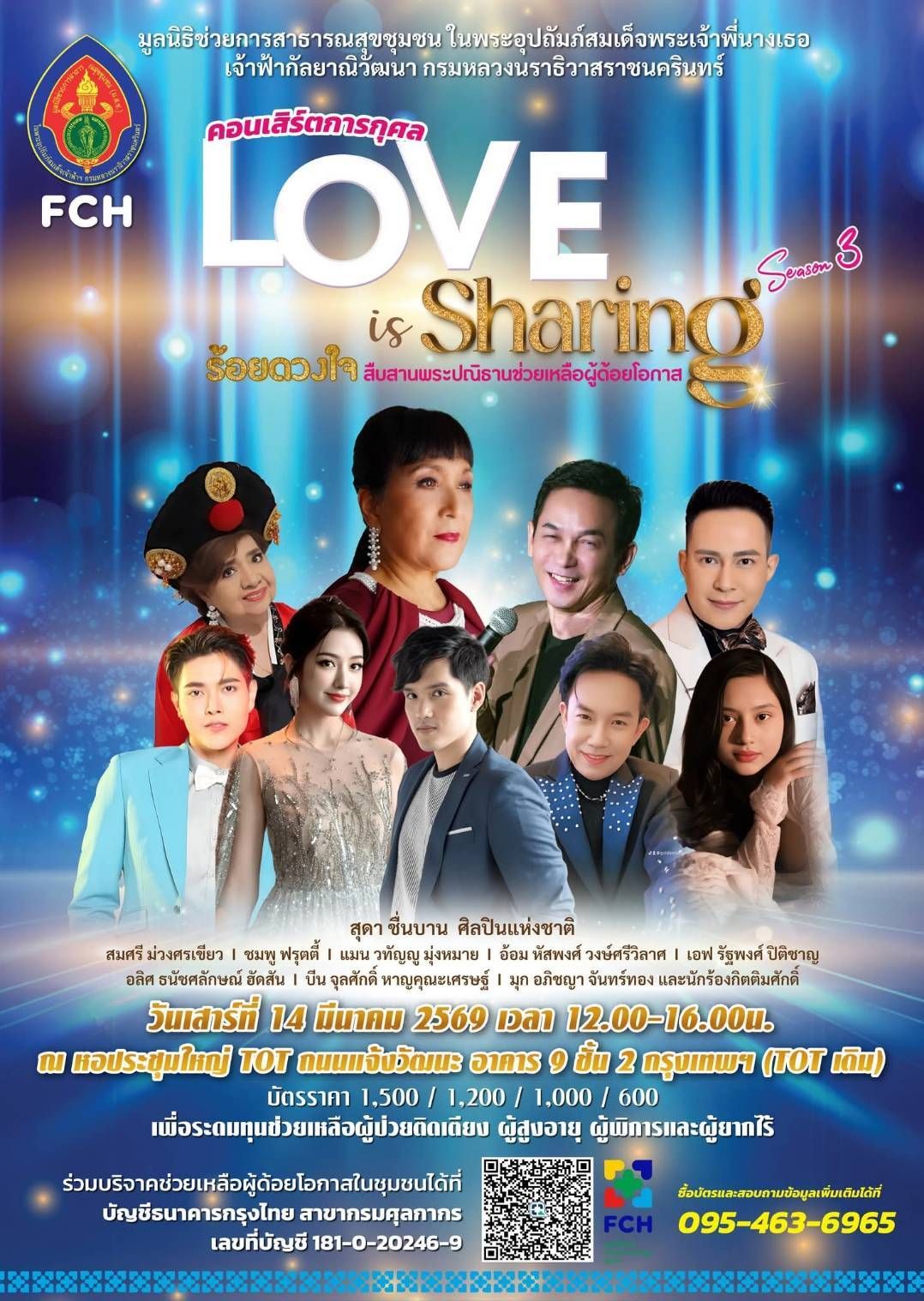 คอนเสิร์ตการกุศล Love is Sharing ร้อยดวงใจสืบสานพระปณิธานช่วยเหลือผู้ด้อยโอกาส ณ หอประชุมใหญ่ TOT ถนนแจ้งวัฒนะ อาคาร 9 ชั้น 2 กรุงเทพฯ (TOT เดิม) วันเสาร์ที่ 14 มีนาคม 2569 เวลา 12.00 – 16.00 น.