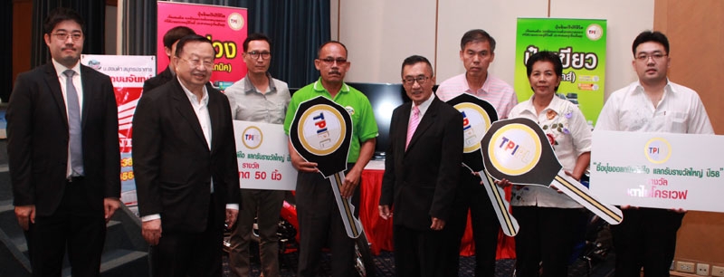 ส่งเสริมการขาย : ประชัย เลี่ยวไพรัตน์ ปธ.จนท.บห.และ ประทีป เลี่ยวไพรัตน์ กก.ผจก.ใหญ่ บมจ.ทีพีไอ โพลีน มอบรางวัล แก่ผู้โชคดีจากทั่วประเทศที่ซื้อปุ๋ยออร์แกนิคทีพีไอ ของ บจก.ทีพีไอ โพลีน ชีวะอินทรีย์ โดยสะสมยอดการสั่งซื้อเพื่อแลกรับ ของรางวัล อาทิ รถจักรยานยนต์, โทรทัศน์สีขนาด 50 นิ้ว, เตาอบไมโครเวฟ, เครื่องแฟกซ์มัลติฟังก์ชั่น, ตู้เย็นขนาด 8 คิว, โทรศัพท์ มือถือไอโฟน 6S และเครื่องคอมพิวเตอร์โน้ตบุ๊ค และให้สะสมได้ถึงวันที่ 31 ธ.ค. 2559 เพื่อรับรางวัลงวดต่อไป ที่อาคารทีพีไอ