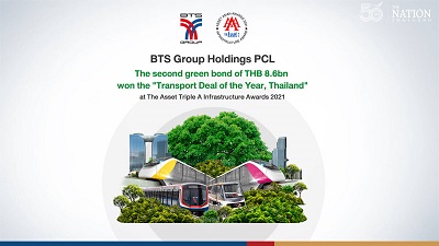 BTS Group Holdings Public Company Limited (“The Company” or “BTSG”) successfully issued senior unsecured Bonds to institutional and high-net-worth investors with 2.1 times oversubscription, in which the Company decided to exercise greenshoe option, bringing total Bonds issued to THB 13,000 million. The Bonds were rated ‘A’ by TRIS Rating and will be used for debt refinancing. In addition to this, BTSG recently won the “Transport Deal of The Year” Award, a regional award from The Asset Triple A Infrastructure Awards 2021 by The Asset, the leading financial magazine in Asia, for THB 8,600 million Green Bond Issuance in November 2020, emphasising BTSG’s commitment in sustainable business practice.