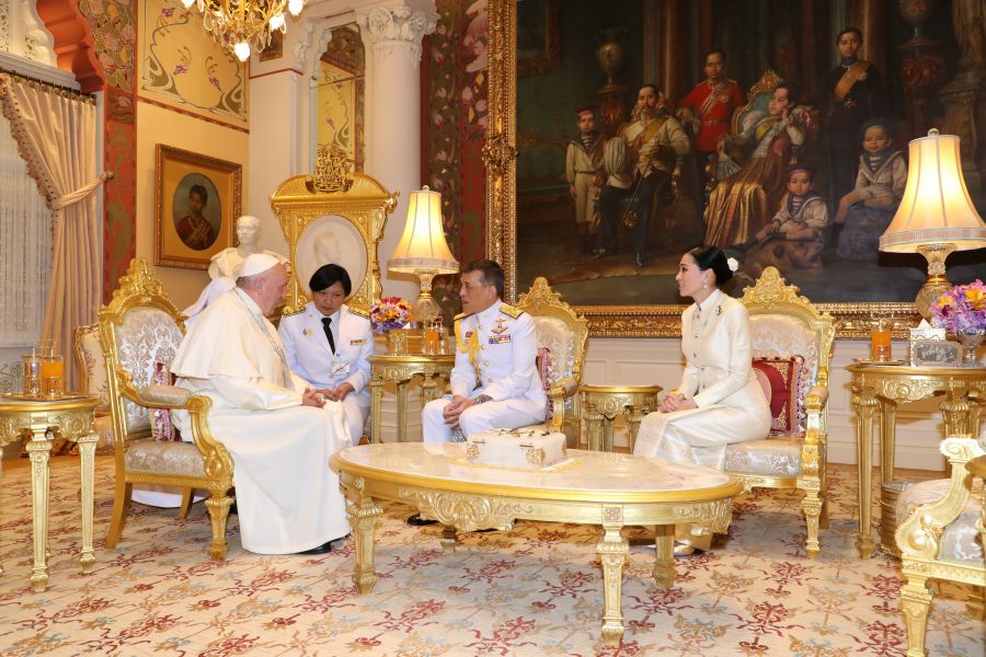 At 5.05pm on Thursday November 21, Their Majesties King Maha Vajiralongkorn and Queen Suthida welcomed His Holiness Pope Francis, head of the Roman Catholic Church, at Amphorn Sathan Residential Hall, Dusit Palace in Bangkok.