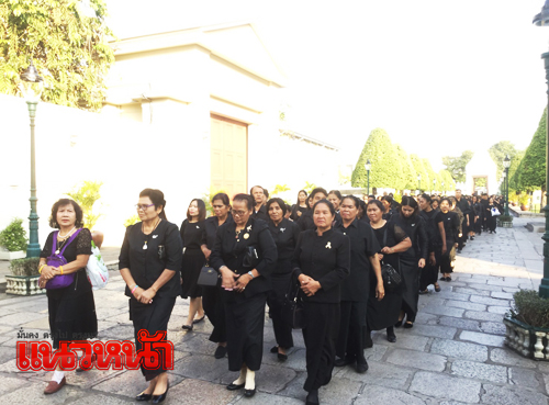 ด้าน น.ส.นุจรินทร์ โมธาราช อายุ 33 ปี พร้อมด้วย น.ส.ขวัญเนตร หลำทุ่ง อายุ 37 ปี พนักงานบริษัท ทอสเท็ม ไทย จำกัด นิคมอุสาหกรรมนวนคร จ.ปทุมธานี เดินทางมาพร้อมกับเพื่อนร่วมงานในโอกาสวันหยุดรัฐธรรมนูญ เข้ากราบสักการะพระบรมศพ โดยพนักงานสาวทั้ง 4 พร้อมใจกันกล่าวถึงความซาบซึ้งในพระมหากรุณาธิการที่มีต่อในหลวง ร.9 ว่า คำสอนที่ใกล้ตัวและสามารถน้อมนำมาใช้ได้คือหลักเศรษฐกิจพอเพียง โดยรู้จักประหยัด รู้จักใช้ในสิ่งที่จำเป็น รู้จักแบ่งปัน เอื้อเฟื้อเผื่อแผ่ต่อกัน หากทำได้สังคมก็จะเป็นสุข ที่ผ่านมาถึงแม้จะไม่เคยรับเสด็จฯ แต่ก็รับรู้ว่าพระองค์ท่านเหนื่อยอย่างไร ท่านทรงเป็นแบบอย่างในเรื่องความกตัญญู และทรงมีโครงการในพระราชดำริช่วยเหลือประชาชนและเกษตรกร เช่น การทำฝนเทียม การสร้างอ่างเก็บน้ำ และอีกมากมาย ในหลายพื้นที่มีศูนย์เรียนรู้เศรษฐกิจพอเพียงให้ความรู้ประชาชนในเรื่องการเกษตรและเสี้ยงสัตว์