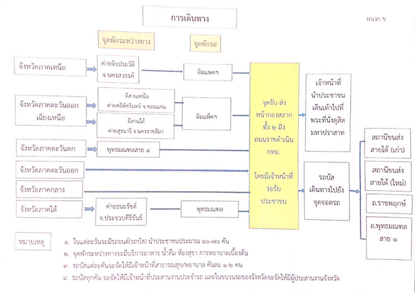 สำหรับขบวนรถแต่ละจังหวัดจะมี 15 คัน เบื้องต้นกำหนดจุดพักคอยไว้ 2 จุดสำคัญคือ ภาคใต้ พักคอยที่พุทธมณฑลสาย 4 ส่วนภาคเหนือและอีสานพักคอยที่อิมแพ็คเมืองทองธานี เพื่อรอการประสานให้ทยอยเข้ามาทีละขบวนป้องกันปัญหาจราจร ยืนยันว่าประชาชนที่เดินมาทางมากับกระทรวงมหาดไทยก็ต้องรับบัตรคิวเหมือนประชาชนทั่วไป
