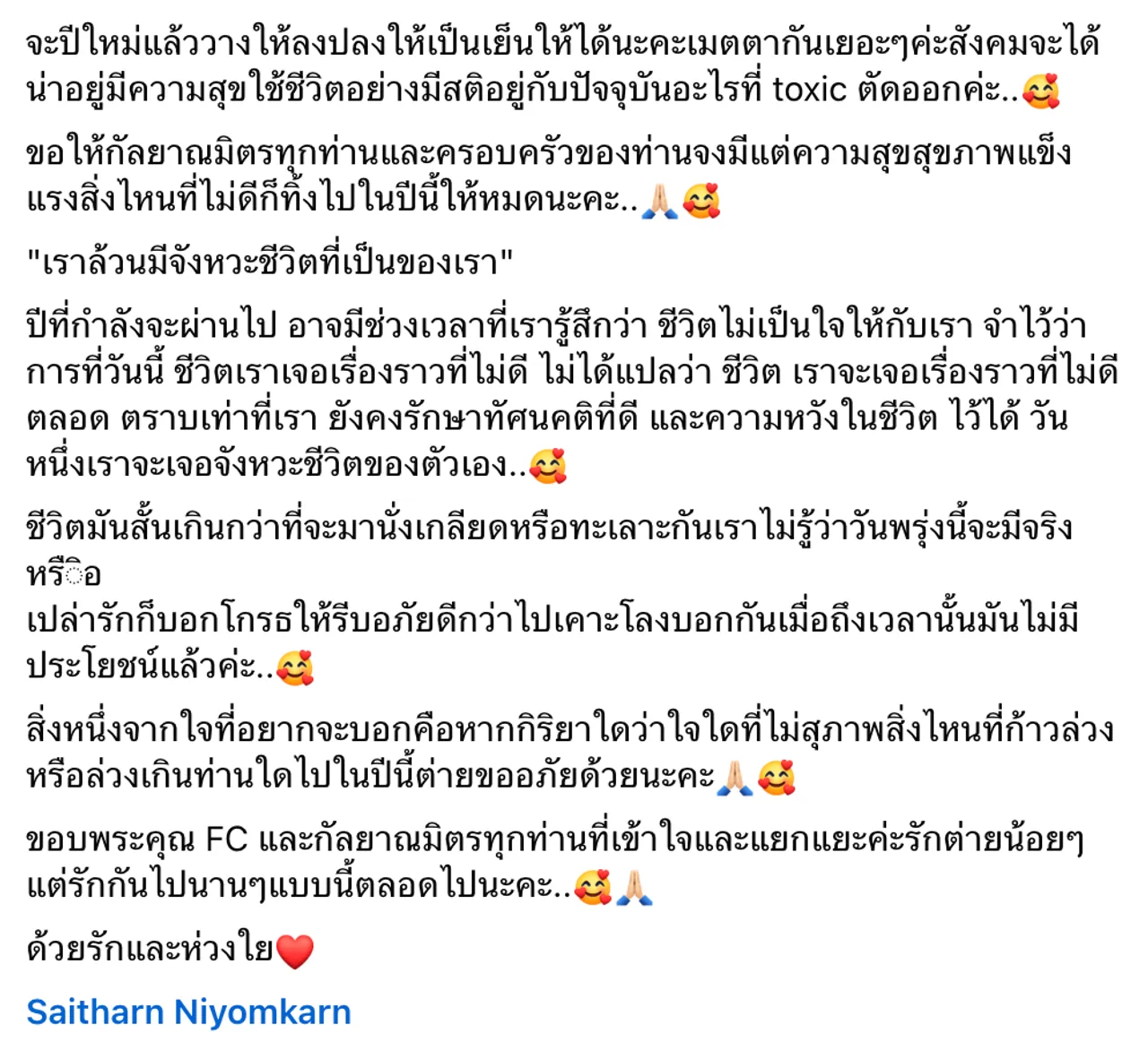 จะปีใหม่แล้ว วางให้ลง ปลงให้เป็น เย็นให้ได้นะคะ เมตตากันเยอะๆ ค่ะ สังคมจะได้น่าอยู่มีความสุข ใช้ชีวิตอย่างมีสติอยู่กับปัจจุบัน อะไรที่ toxic ตัดออกค่ะ..