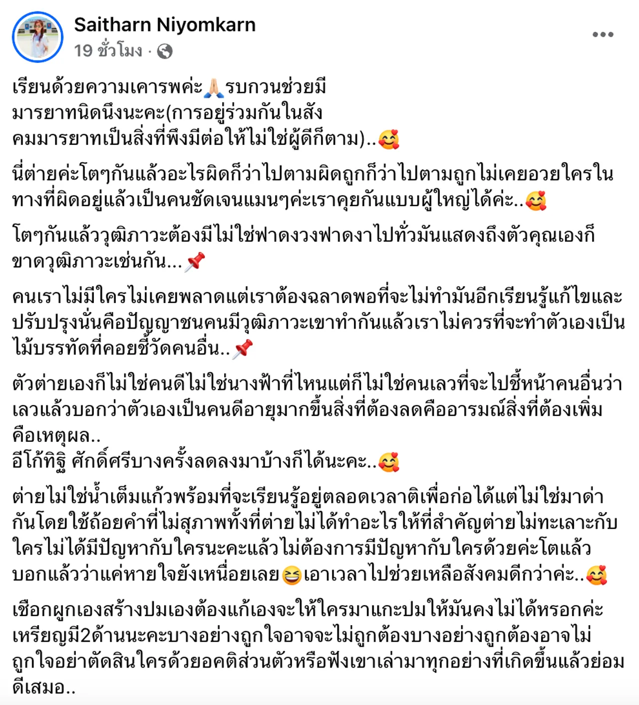 ต่าย สายธาร โพสต์ร่ายยาวถึงใครบางคน ให้มีมารยาทในการอยู่ร่วมกับสังคม