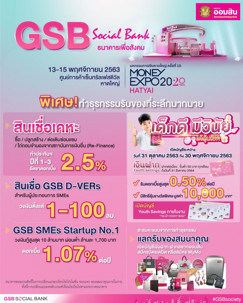 The Government Savings Bank (GSB) will launch two loans – the GSB Housing Loan for homebuyers and GSB D-VERs for businesses at Money Expo 2020 to be held at Central Festival Hat Yai in Songkhla November 13-15, bank president Withai Ratanakorn said.