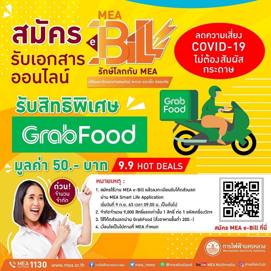 The Metropolitan Electricity Authority (MEA) is offering a Bt50 GrabFood voucher for customers who apply for its e-billing service via mobile phone or email.