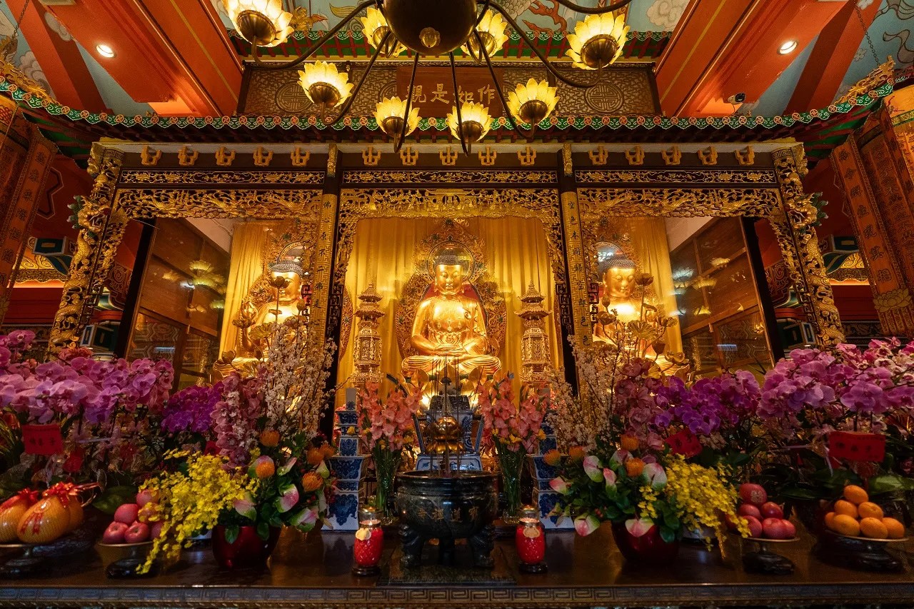 ในวัดแห่งนี้ ถูกออกแบบอย่างถูกต้องตามหลักฮวงจุ้ย โดยอาคารต่างๆ จะสร้างให้อยู่ไม่ติดกัน เพื่อให้อากาศถ่ายเทสะดวก หากเกิดไฟไหม้ ไฟก็จะไม่ลามไปยังตัวอาคารอื่นได้โดยง่าย นอกจากนั้นยังมีอุโบสถหลัก (Main Shrine Hall of Buddha) ตั้งอยู่ใจกลางวัด เป็นที่ประดิษฐานของพระพุทธเจ้า 3 องค์ในนิกายมหายาน นั่นก็คือ